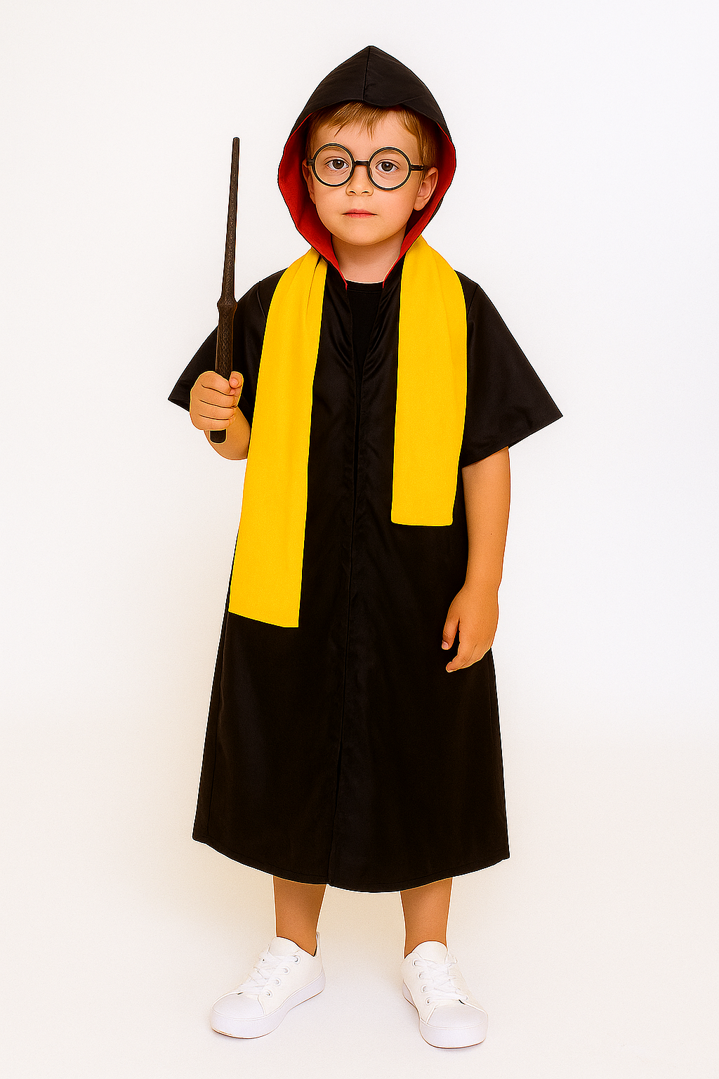 Capa preta Bruxo HP, estilo túnica aberta, com capuz forrado em tecido vermelho e mangas curtas.
