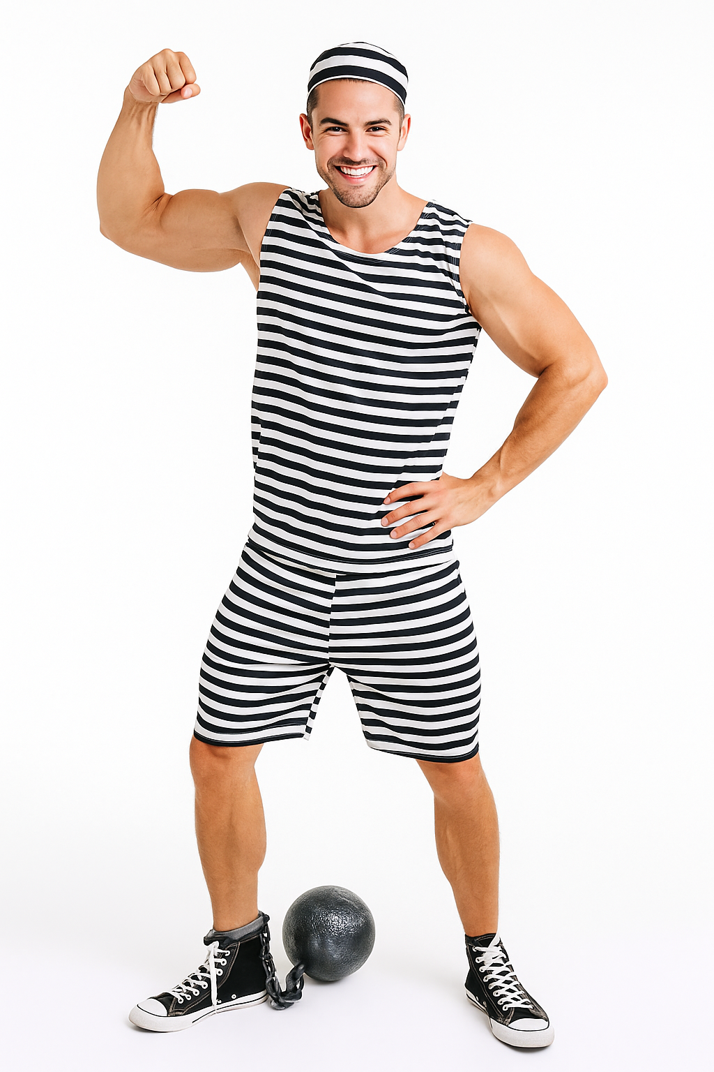 Fantasia conjunto Presidiário, composta por bermuda, camiseta modelo regata e quepe.