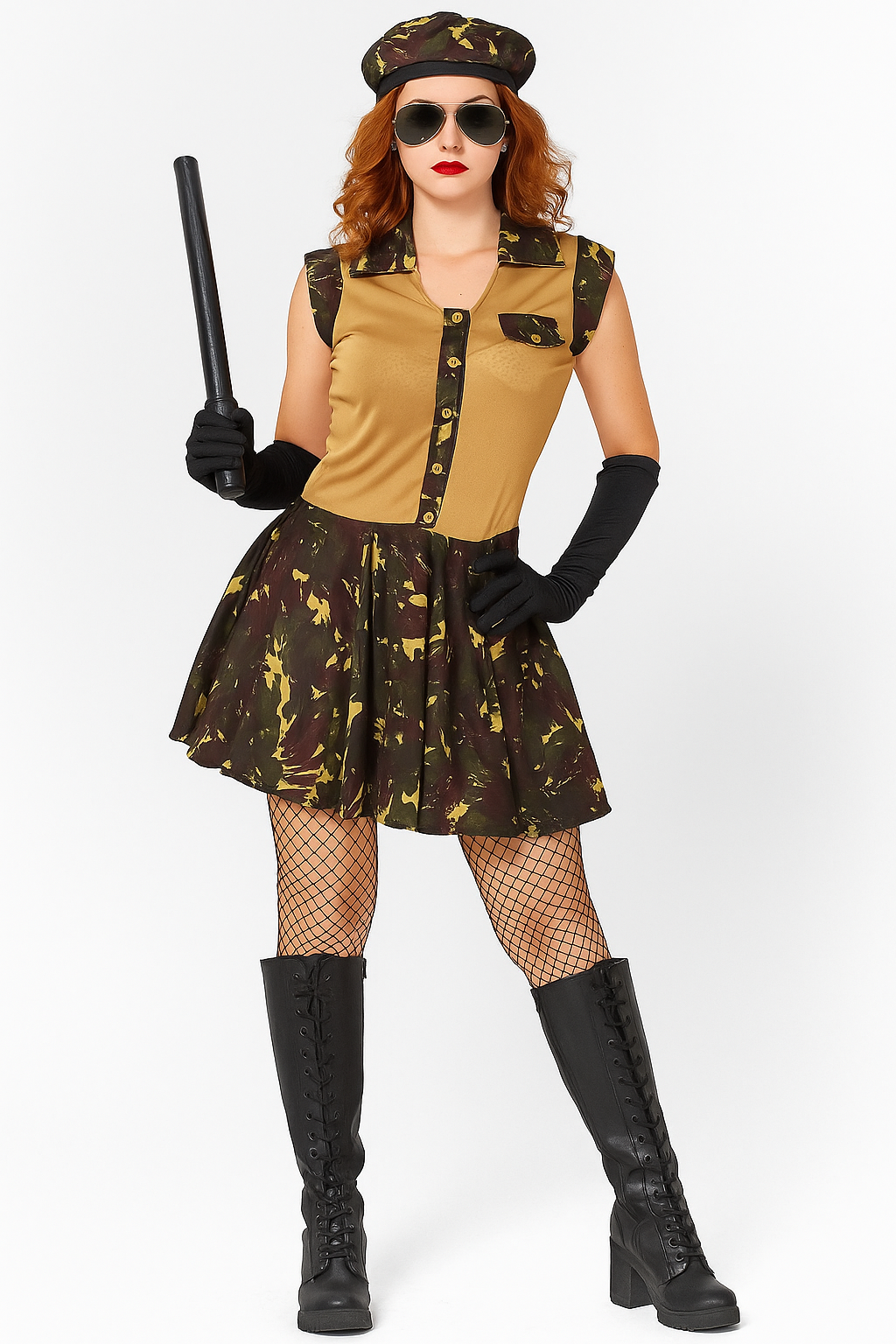 Transforme sua festa em uma missão com esta fantasia militar feminina superestilosa e cheia de atitude! O modelo é confeccionado com design sensual e ajustado ao corpo, ideal para quem quer arrasar em festas à fantasia, baladas temáticas ou até no Halloween.