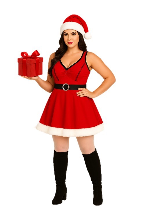 A fantasia Mamãe Noel é super confortável, feita em helanca, permitindo que você fique mais a vontade nas festas e eventos, seja trabalhando para garantir a alegria da criançada ou se divertindo. O detalhe de pelúcia na barra dá um toque especial, remetendo à imagem que temos do Papai Noel em um local frio. O gorro e as meias NÃO ACOMPANHAM esse vestido, sendo apenas ilustrativos para que você possa ter uma idéia de combinações.