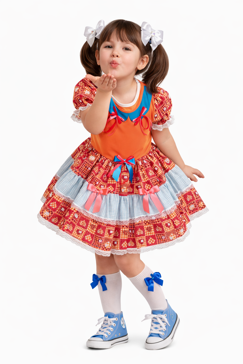 Com blusa em helanca, garante conforto e mobilidade para quem o usar. A saia e as maguinhas são em tecido estampado misto, que fica bem cheinho como as meninas gostam.